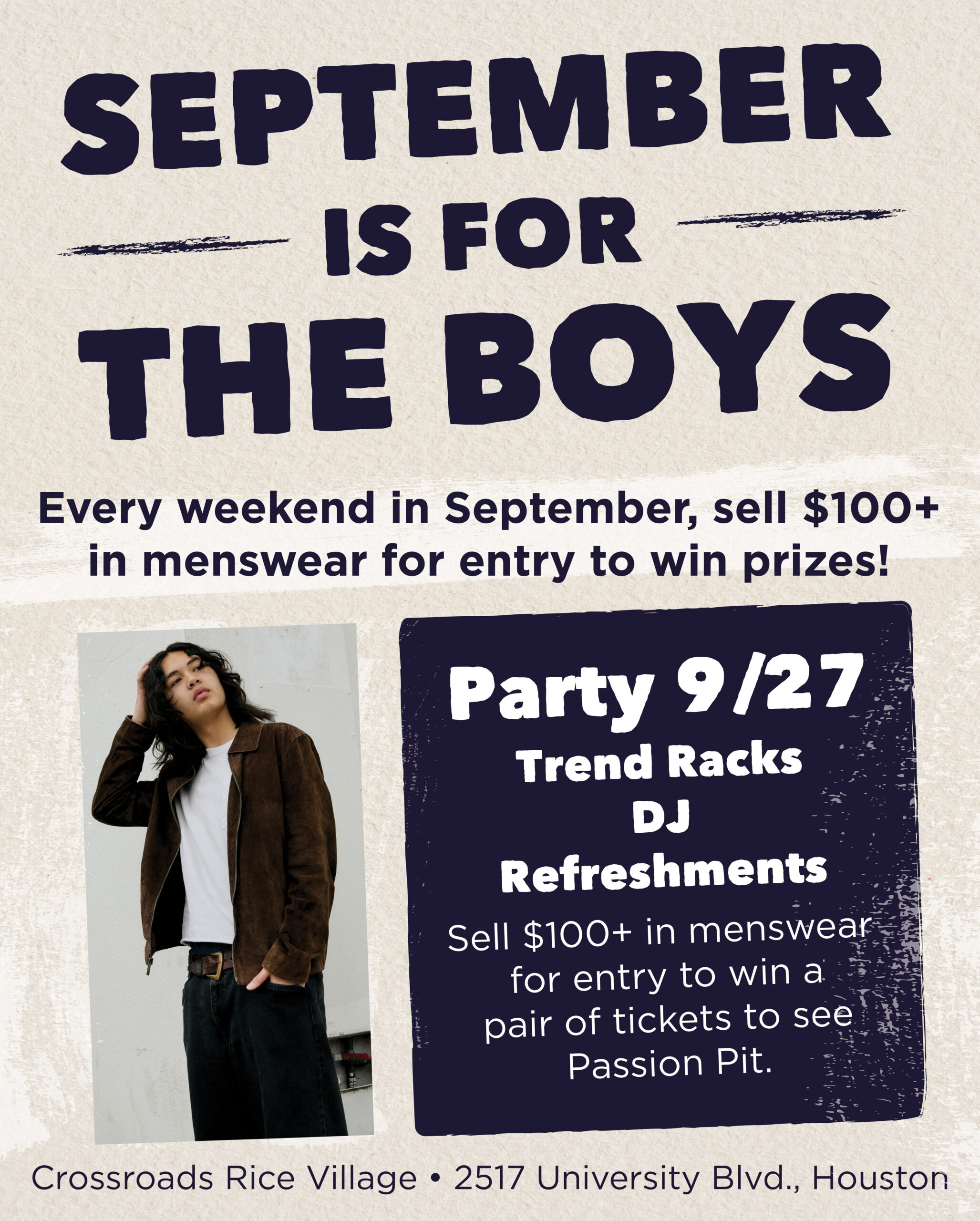 Crossroads Rice Village, Houston 2517 University Blvd, Houston, TX, United StatesSeptember Is For The Boys! All September long, sell $100+ in menswear for entry to win prizes! We will pick winners every weekend! We’re ending with a bang! Join us […]