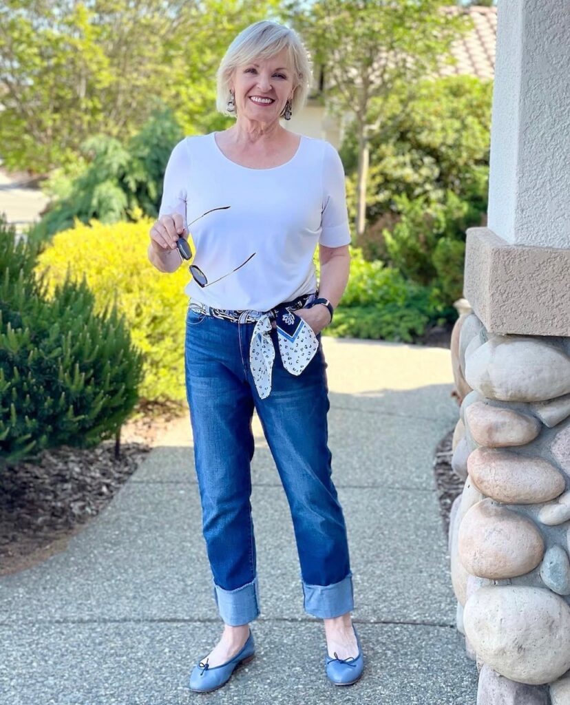 We recommend starting simple. Thread a lightweight scarf through the loops of your favorite denim and knot it slightly off-center. This small shift instantly adds interest. Pair this look with a simple tee and flats, and you’ve got an outfit that feels equal parts relaxed and refined.