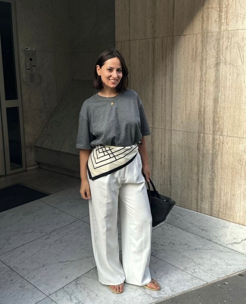 If you lean more polished, try tying a scarf around the waist of tailored trousers or over a blazer. It creates a cinched silhouette without the rigidity of a leather belt, and the contrast between structure and fluidity stands out. Look for scarves with subtle prints or tonal colors to keep things elevated.