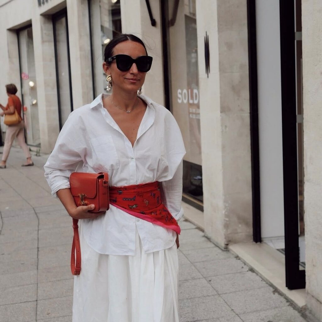 Dresses and oversized shirts are where this styling trick really shines. Wrap a scarf belt around a flowy midi or oversized button-down to define your shape while maintaining that easy, draped feel. Let the ends hang loose for a casual vibe, or tuck them in for something more streamlined.
